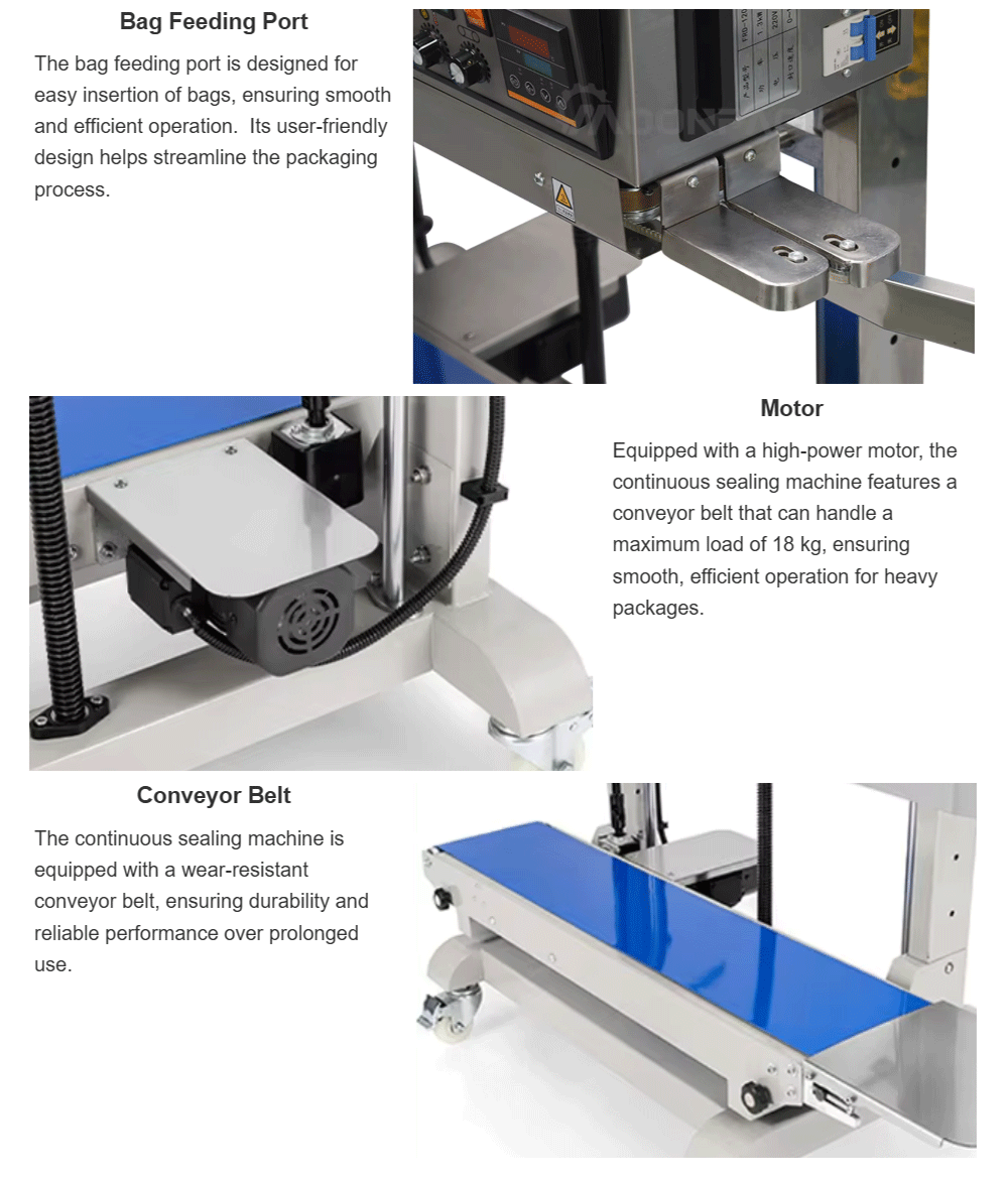 Continuous sealing machine is designed for sealing various materials like plastic, aluminum, and composite films. It features a robust construction for durability and reliable performance. With adjustable speed and temperature settings, it can handle different types of bags and pouches. The user-friendly interface allows for easy operation and minimal maintenance.