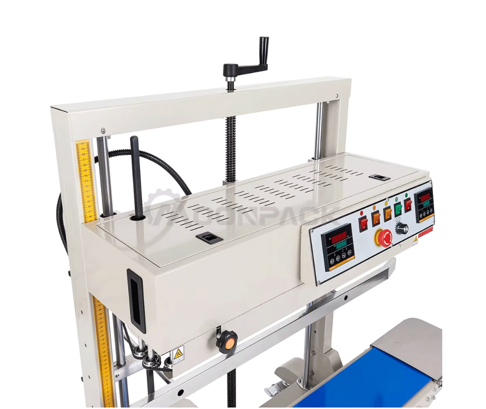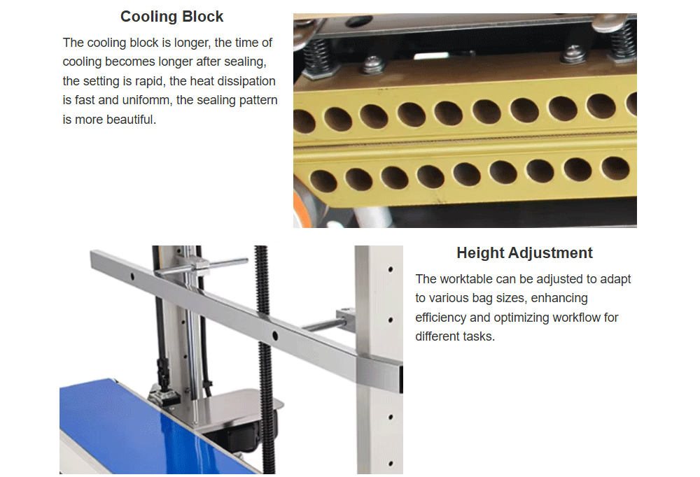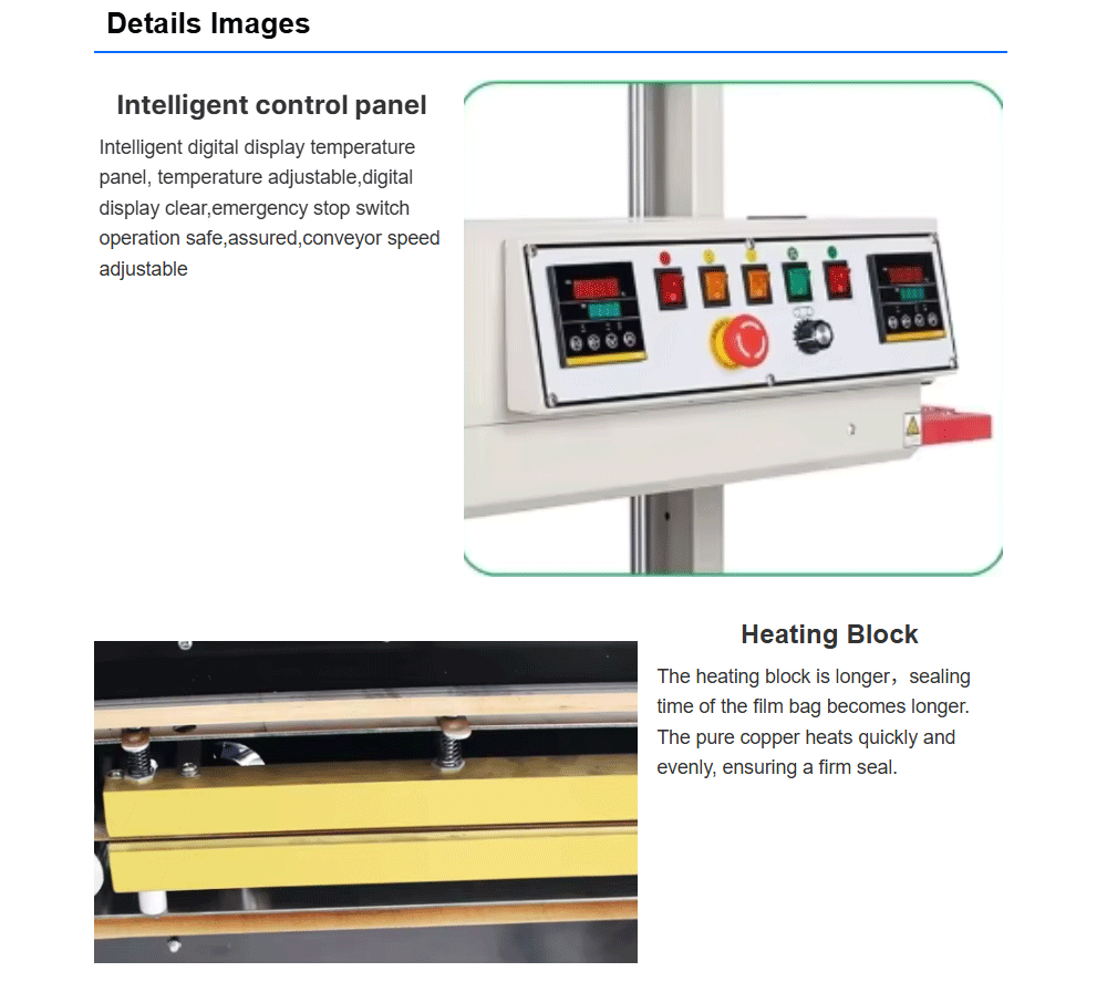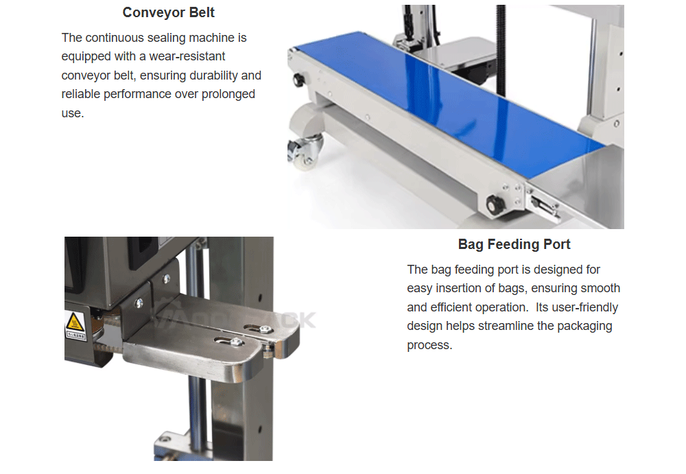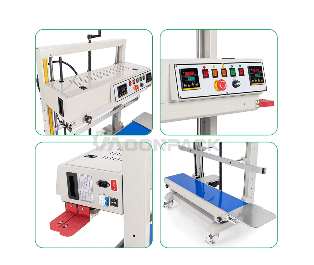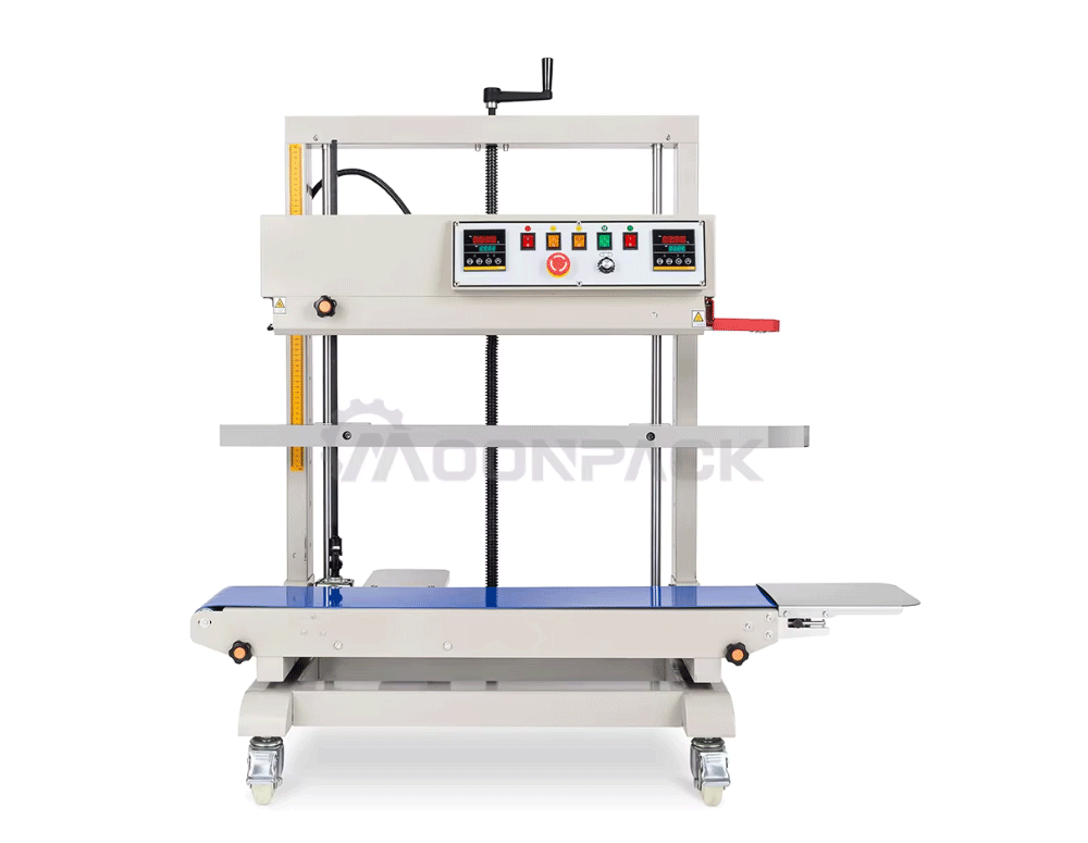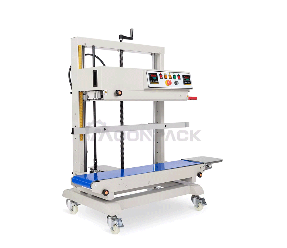 The vertical continuous sealing machine is a sealing machine designed for packaging bags made of different materials such as plastic, paper, and foil.The sealing temperature can be adjusted between 0 and 300 degrees Celsius. The sealing speed can also be adjusted from 0 to 12 m/min, and the sealing pressure can be adjusted as well. This sealing machine can seal large bags of packaging and is applied in scenarios such as dog food bags, rice bags, flour bags, and sealing, ensuring that the contents inside the packaging bags are safely sealed.
