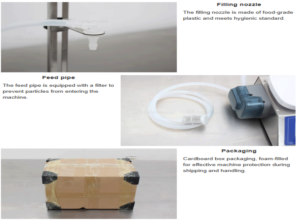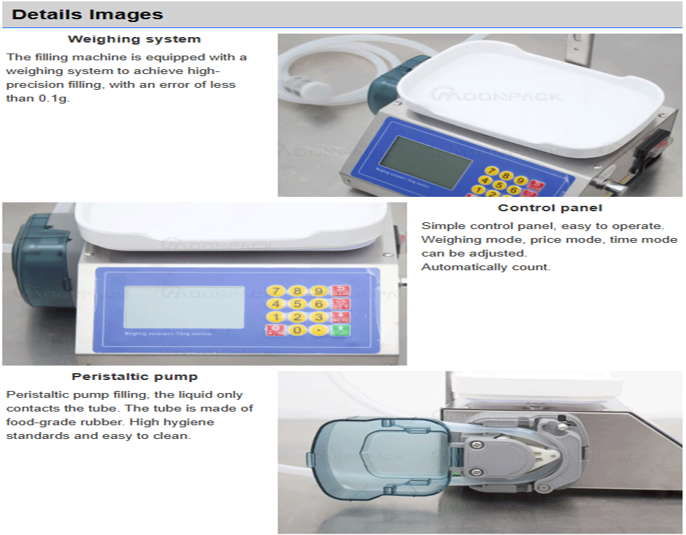 1.It uses a peristaltic pump for filling, making it suitable for liquids without granules, such as perfume, glue, essential oils, etc.