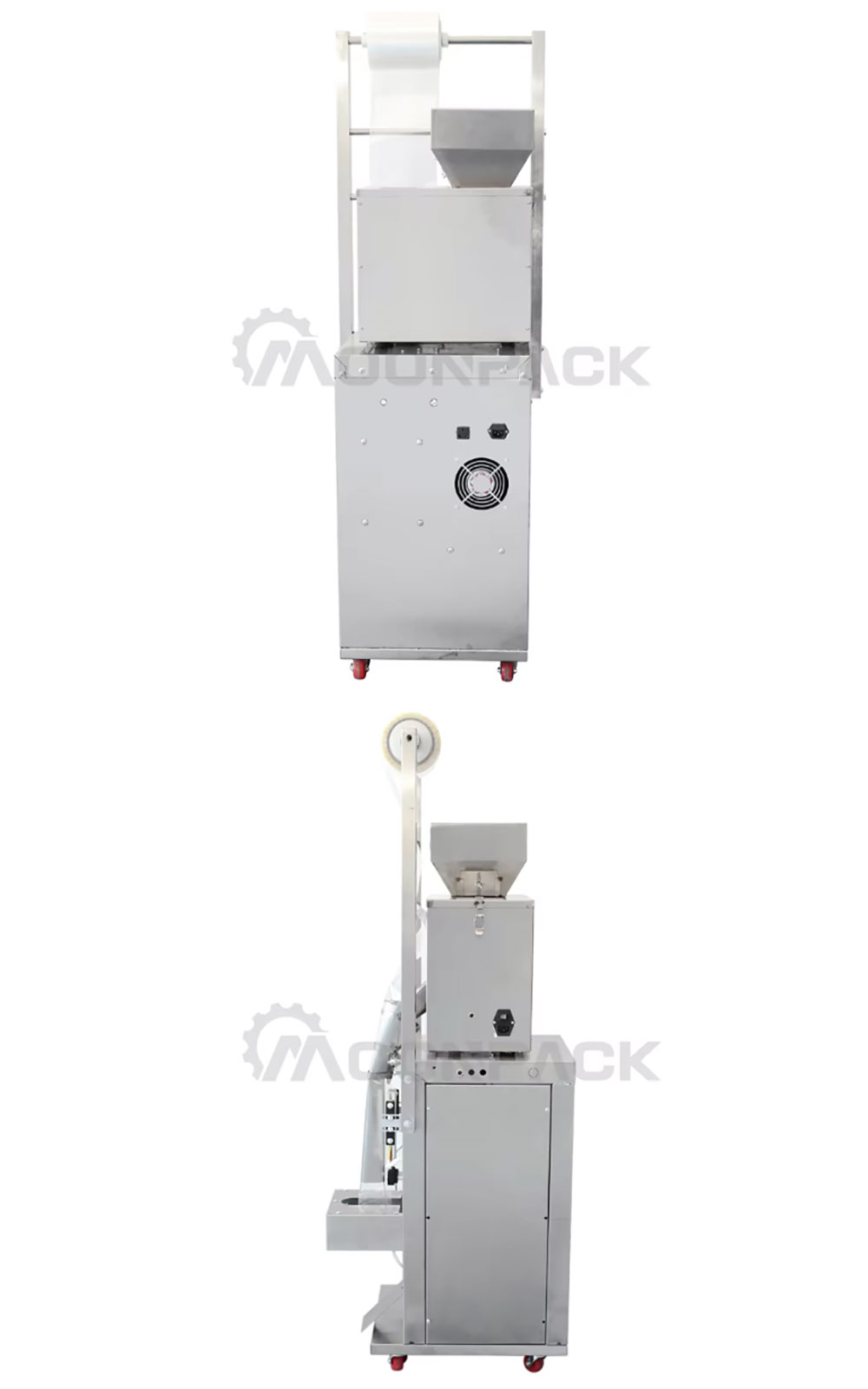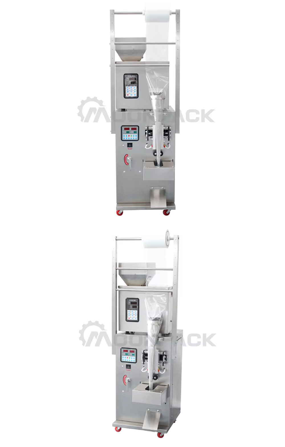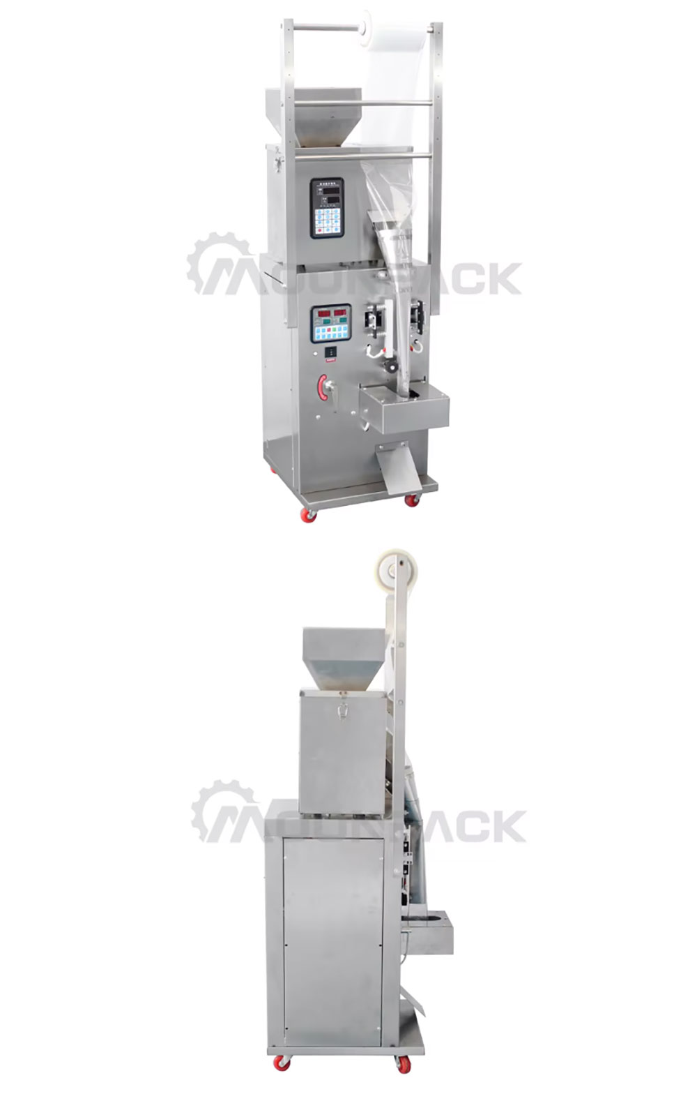 The automatic small pouch multifunctional packaging machine is suitable for packaging small granular materials such as grains, tea, and coffee. Características: 1. It can use plastic film, aluminum foil, and non-woven fabric to package small pouch products. 2. The machine automatically completes bag forming, filling, sealing, cutting, and counting processes. 3. With vibration feeding and quantitative weighing, it ensures high filling accuracy. 4. Its stainless steel construction is durable and complies with hygiene standards.