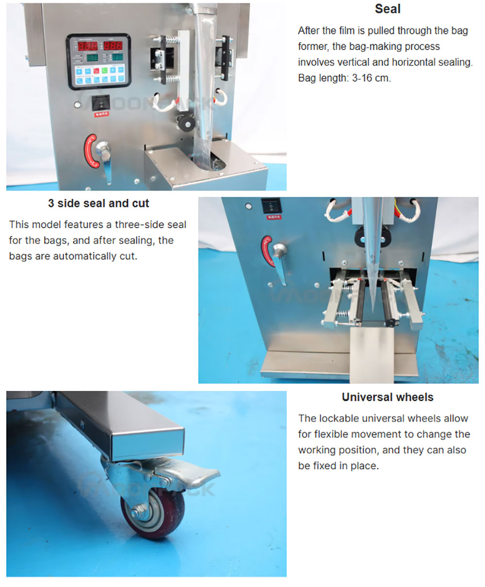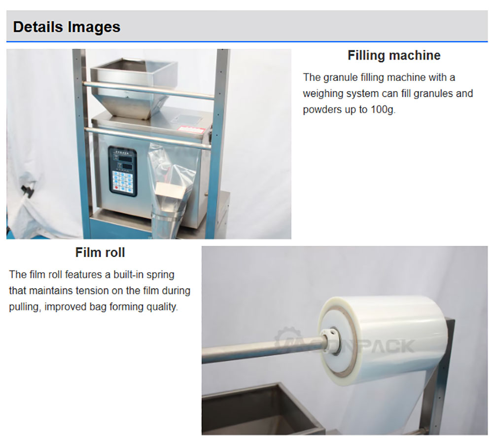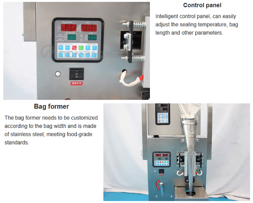 The automatic small pouch multifunctional packaging machine is suitable for packaging small granular materials such as grains, tea, and coffee. Características: 1. It can use plastic film, aluminum foil, and non-woven fabric to package small pouch products. 2. The machine automatically completes bag forming, filling, sealing, cutting, and counting processes. 3. With vibration feeding and quantitative weighing, it ensures high filling accuracy. 4. Its stainless steel construction is durable and complies with hygiene standards.