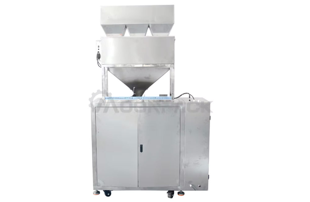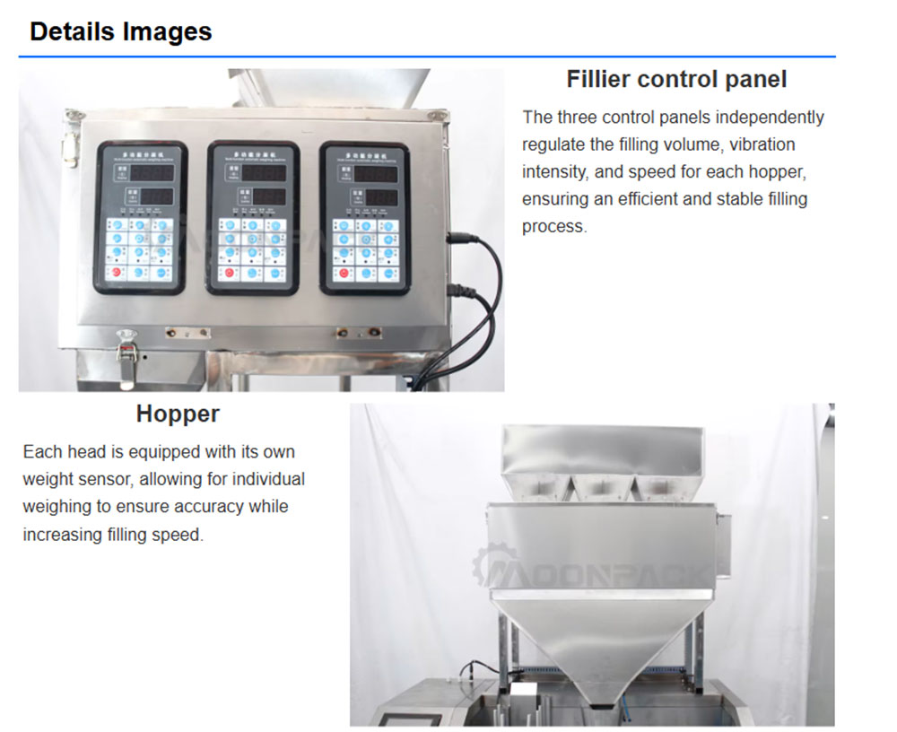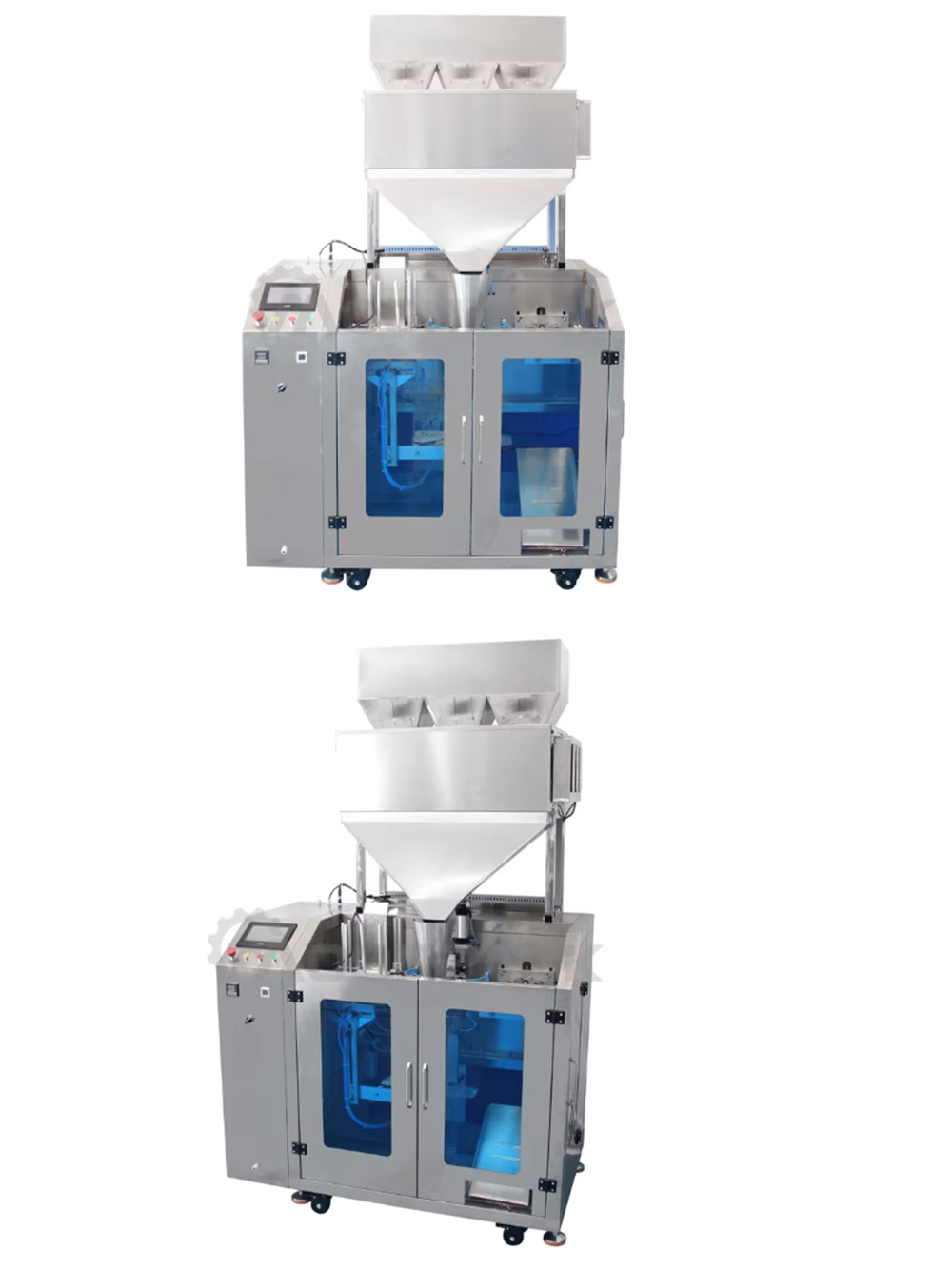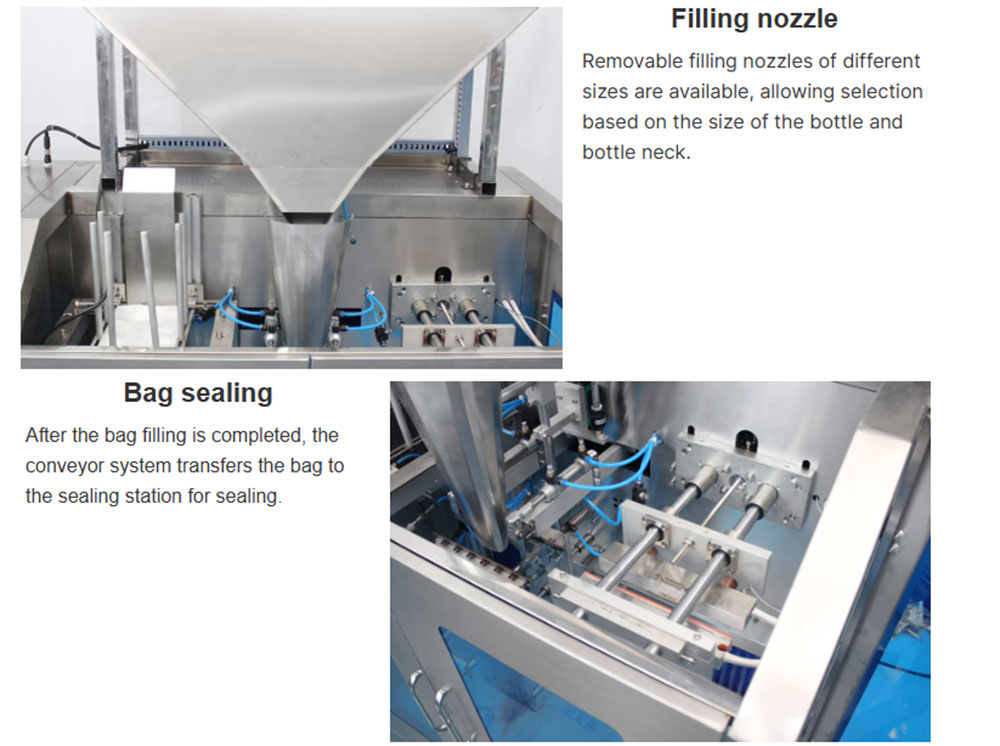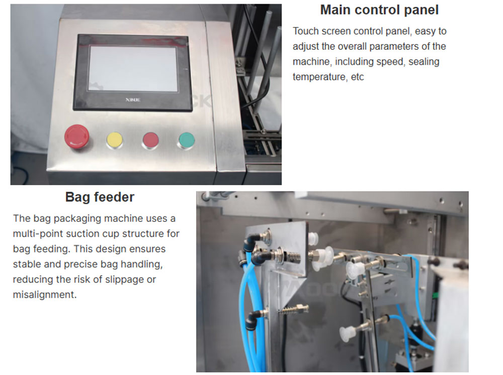 The bag packaging machine is suitable for filling and sealing various types of bags, such as stand-up pouches, aluminum foil bags, and plastic bags. It is ideal for packaging granular products and can also be customized for paste, liquid, and granular packaging needs. Features 1. The machine automatically completes processes including feeding, bag opening, filling, sealing, and coding. 2. It uses a PLC control system and a touch screen operation panel, making it easy to adjust product parameters. 3. The parts in contact with materials are made of 304 stainless steel with food-grade.