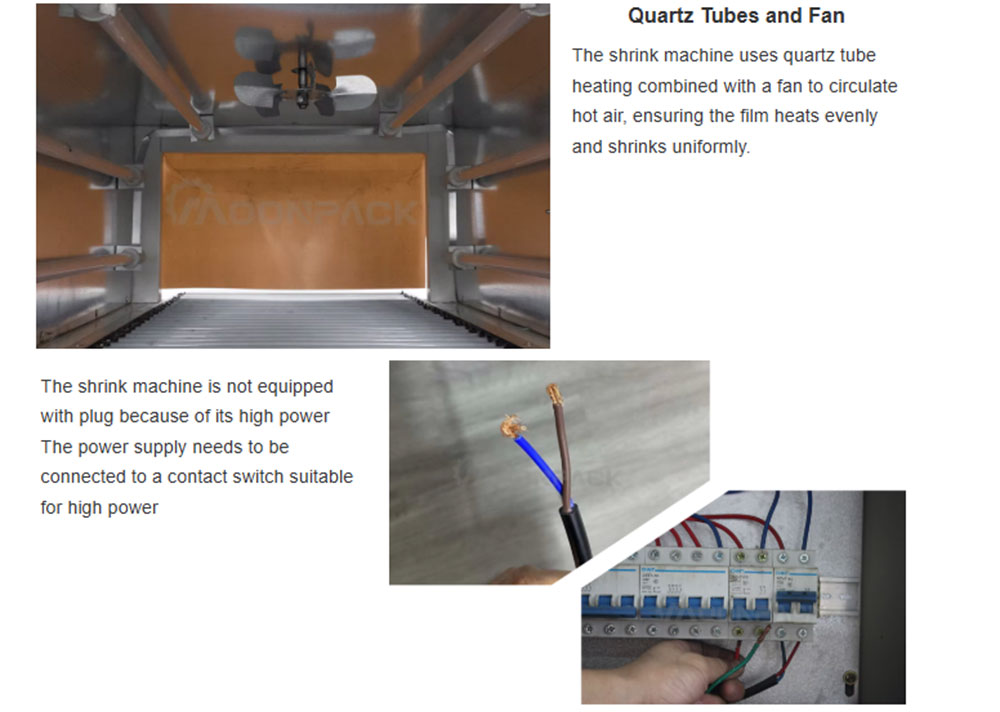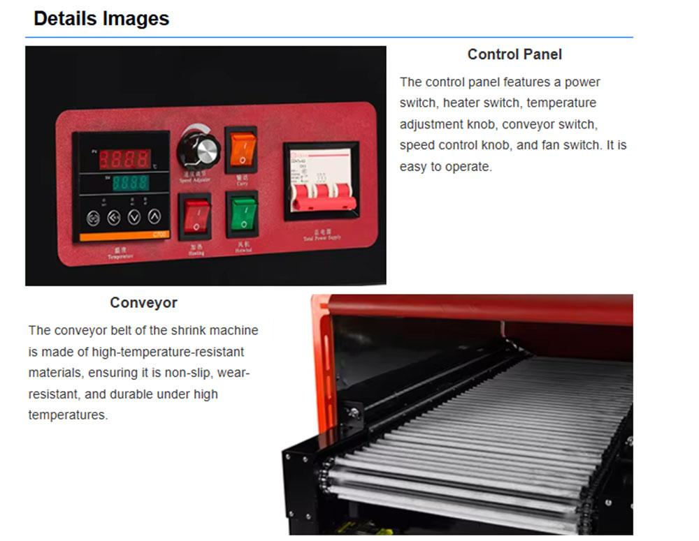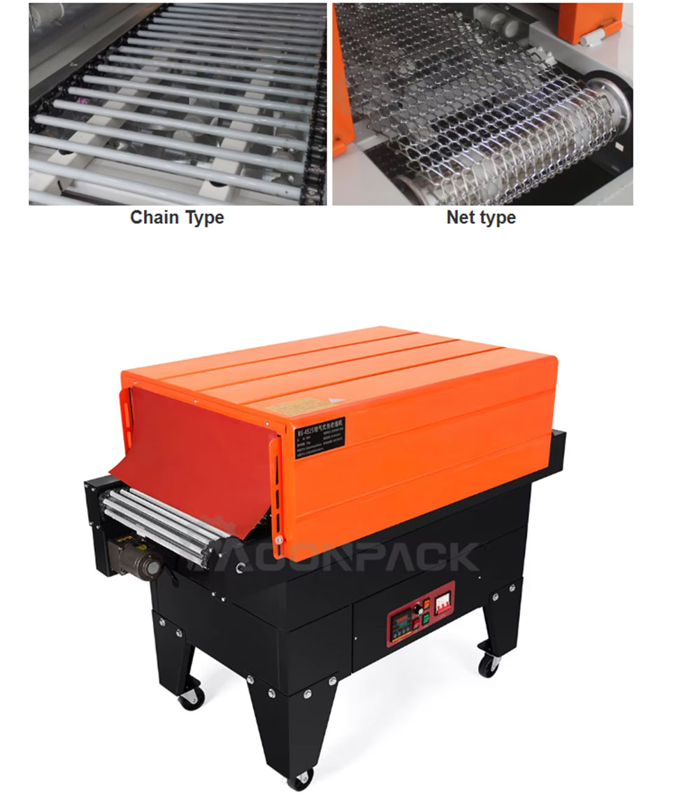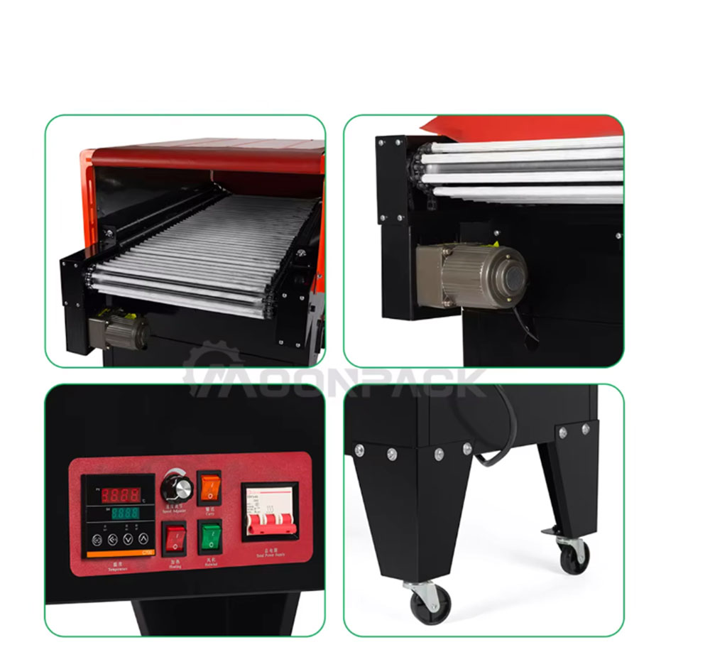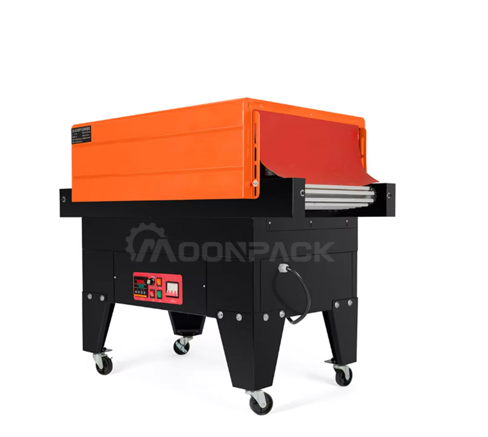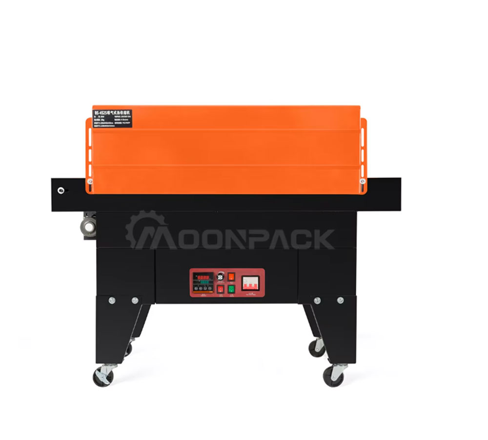 The 4525 Jet Shrink Machine is an efficient heat shrink wrapping equipment, which is mainly used for heat shrink wrapping of products such as bottled beverages, food, cosmetics, etc. Through the air-jet heating technology, the shrink film is quickly wrapped on the surface of the product to form a tight, dust-proof and moisture-proof packaging effect. Quartz tubes and fans are used to ensure uniform shrinkage of PVC/POF/PP films to increase the aesthetics of the packaging. The control panel is simple and