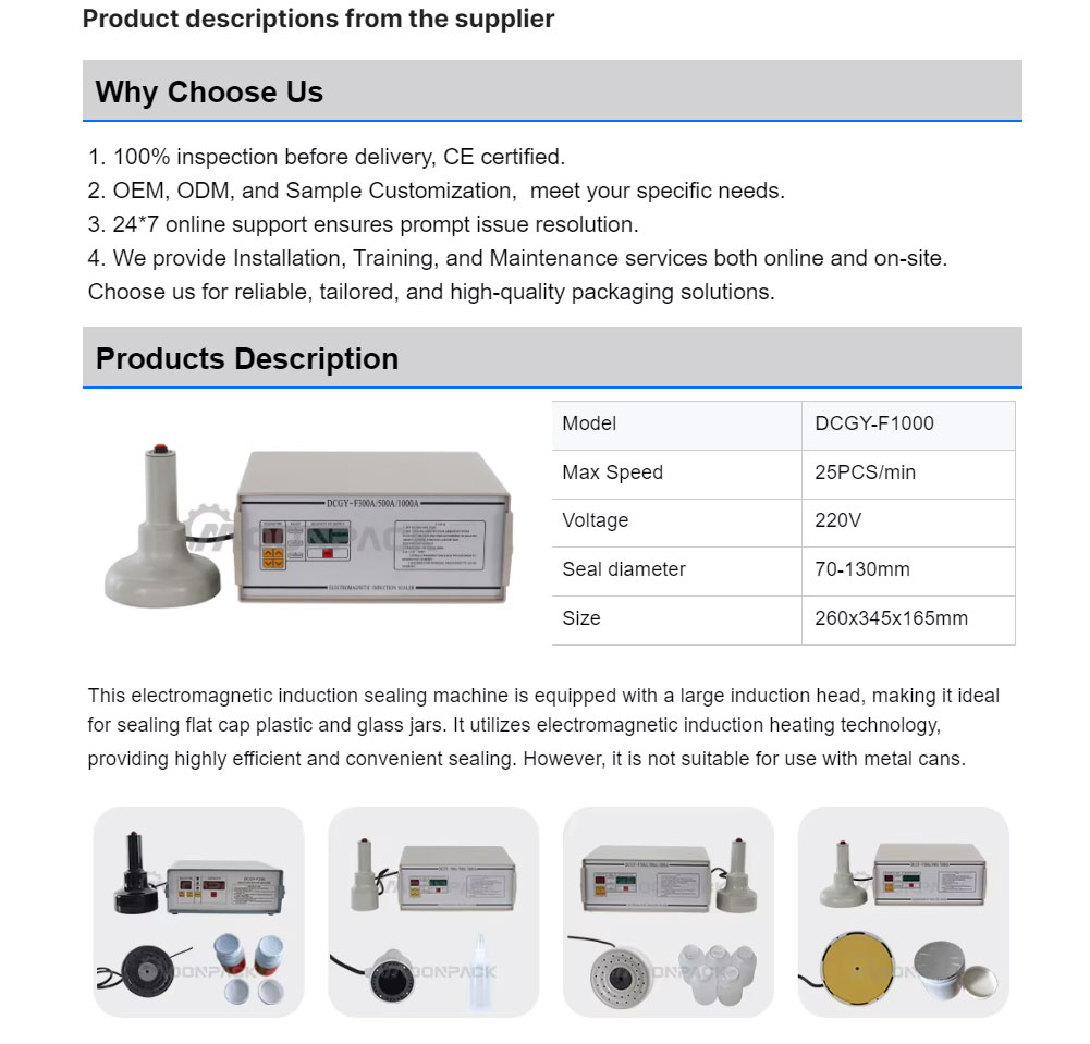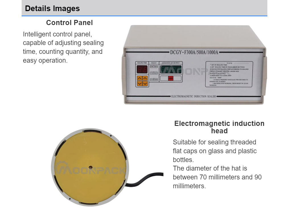 This electromagnetic induction sealing machine is equipped with a large induction head, making it ideal for sealing flat cap plastic and glass jars. It utilizes electromagnetic induction heating technology, providing highly efficient and convenient sealing. However, it is not suitable for use with metal cans.