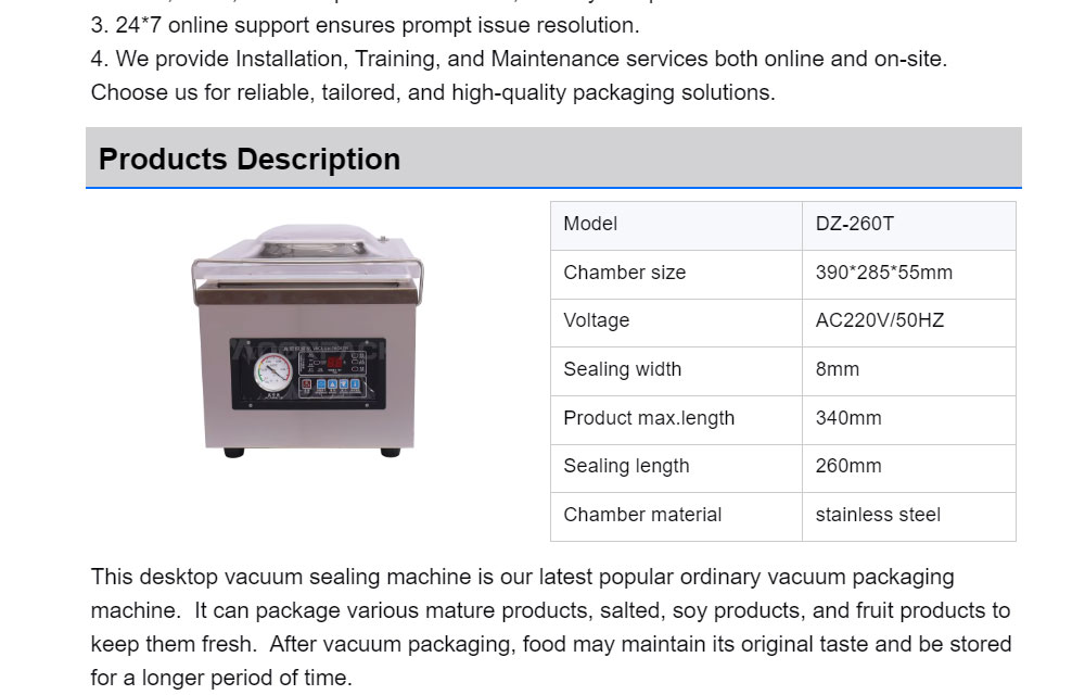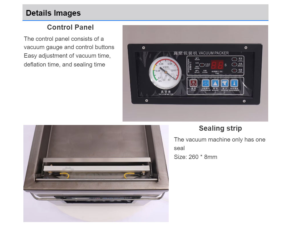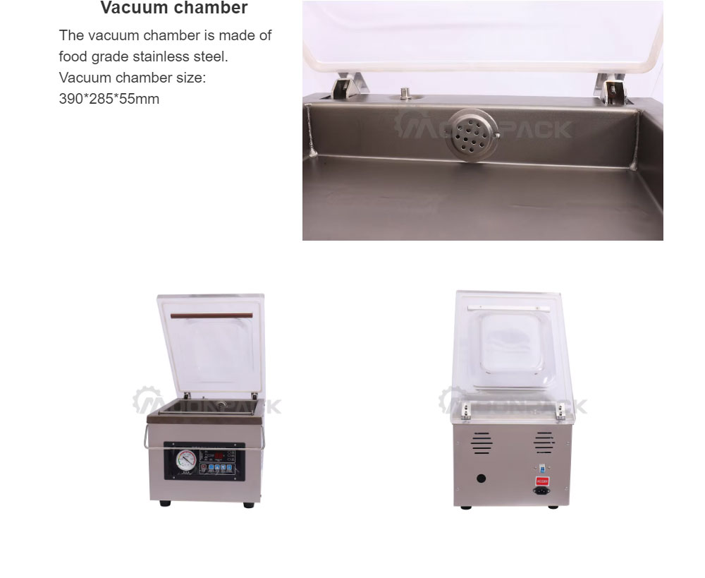 This desktop vacuum sealing machine is our latest popular ordinary vacuum packaging machine. It can package various mature products, salted, soy products, and fruit products to keep them fresh. After vacuum packaging, food may maintain its original taste and be stored for a longer period of time.