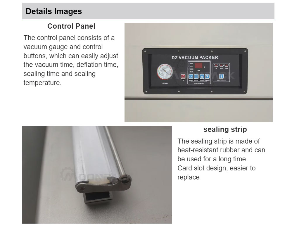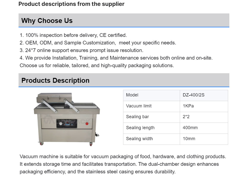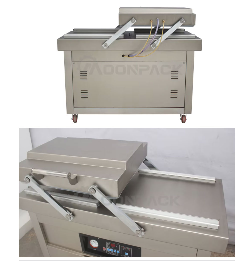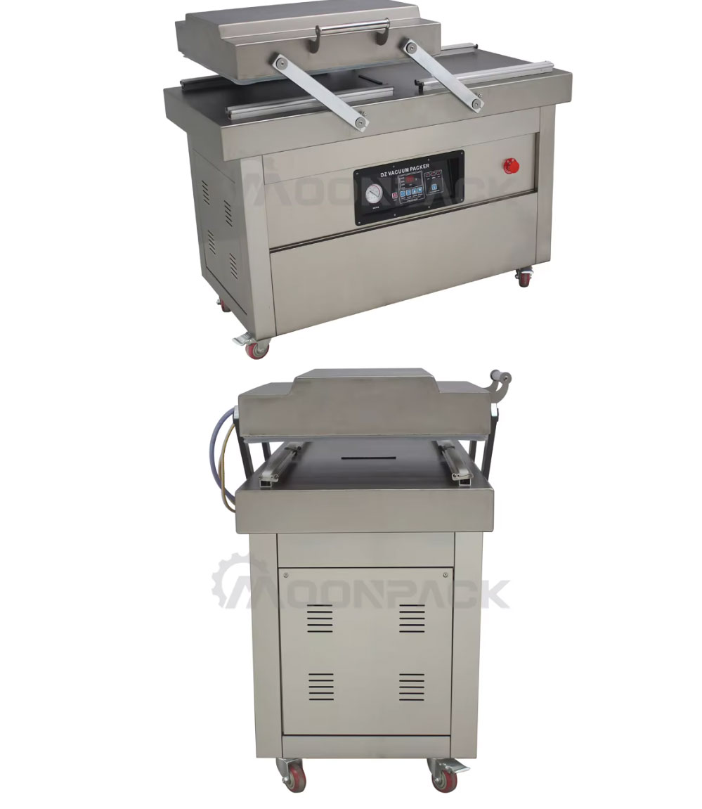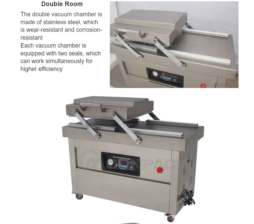 Vacuum machine is suitable for vacuum packaging of food, hardware, and clothing products. It extends storage time and facilitates transportation. The dual-chamber design enhances packaging efficiency, and the stainless steel casing ensures durability.