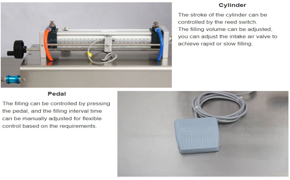1. This machine has two pneumatic filling ways, foot and automatic, and they can be switched randomly.