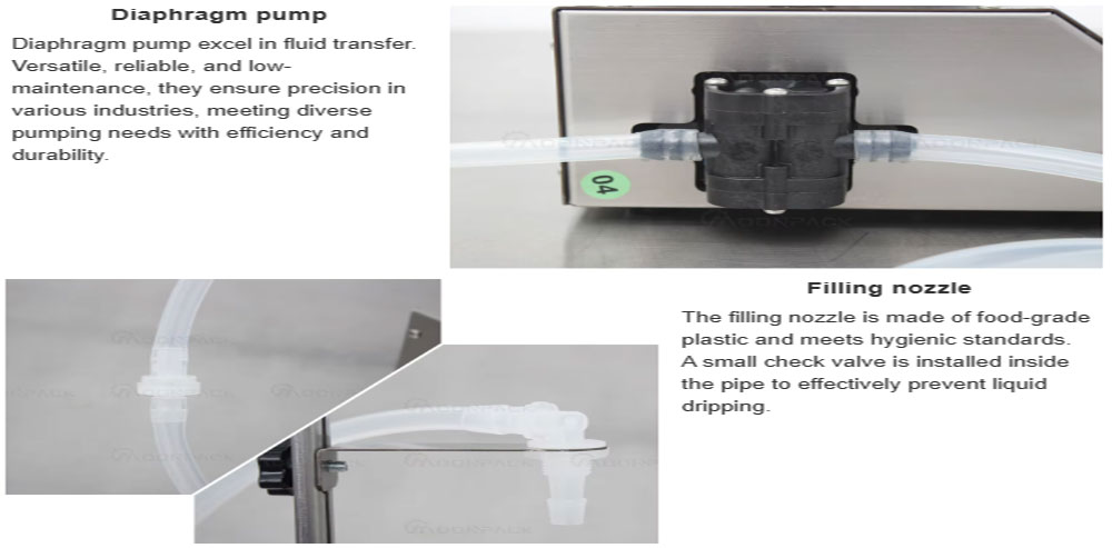 1. It uses a diaphragm pump for filling, making it suitable for pure liquids such as beverages, milk, and water.