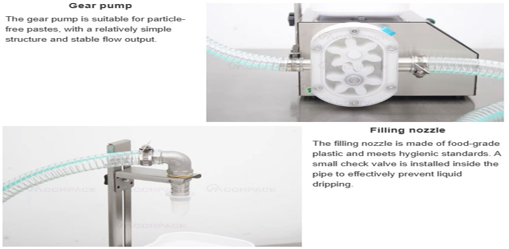 1. It uses a gear pump for filling, making it suitable for pastes such as honey, peanut butter, and ketchup, etc.