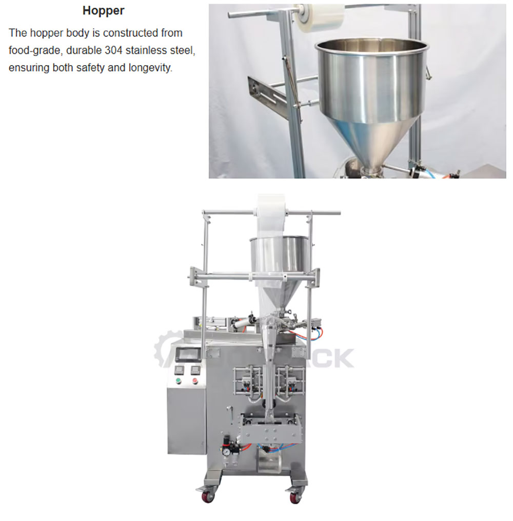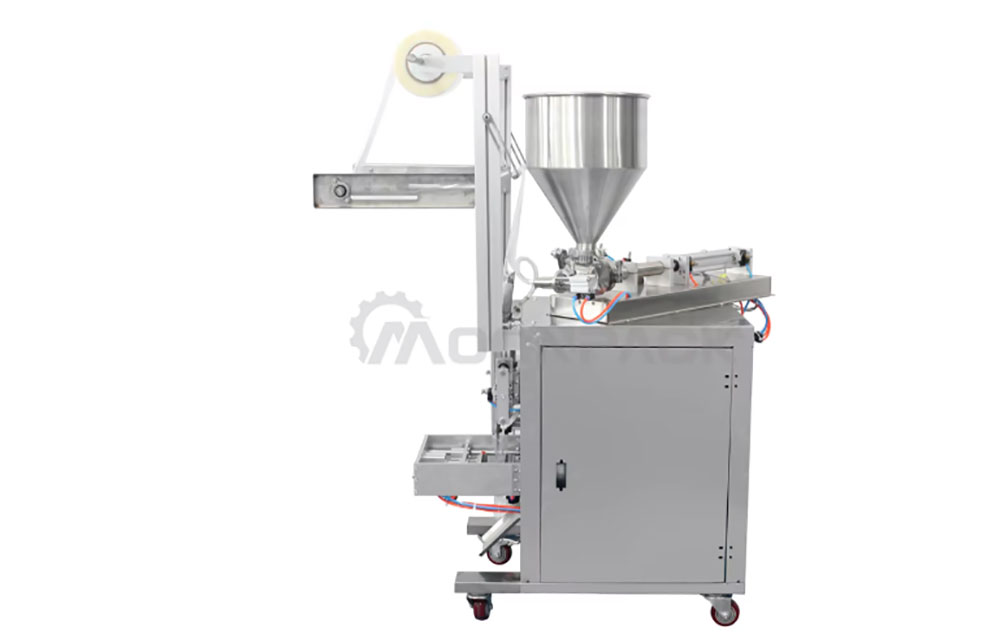 The packaging machine is suit for automatic filling and packing liquid, paste, such as milk, honey, hair shampoo,tomato paste, jam ect.